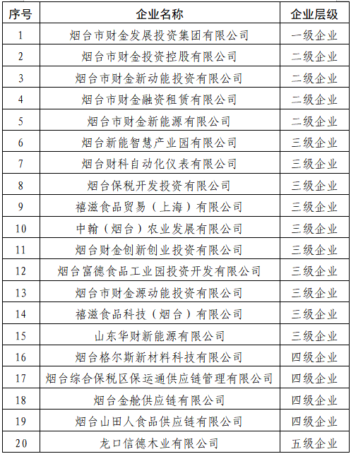 按照國家、省、市關(guān)于《綜合整治假國企央企行動方案》的相關(guān)要求,現(xiàn)將煙臺財金集團(tuán)投資并表范圍內(nèi)國企名單(共計20戶)予以公布,具體如下: